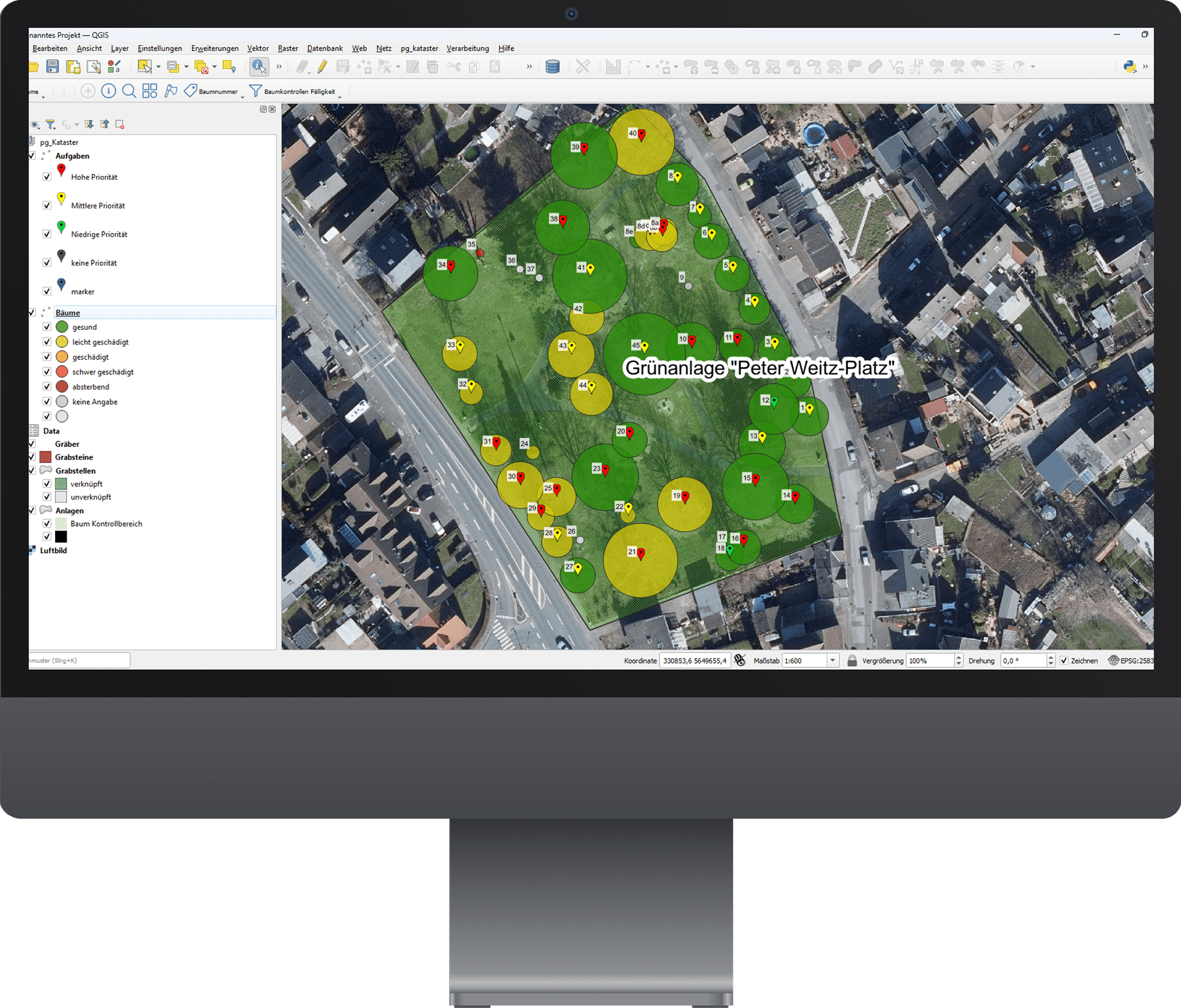 Die Expertenanwendung der PBSGEO basiert auf dem Open Source GIS QGIS und bietet einen umfassenden Funktionsumfang für die Friedhofsplanung und Datenanalyse.