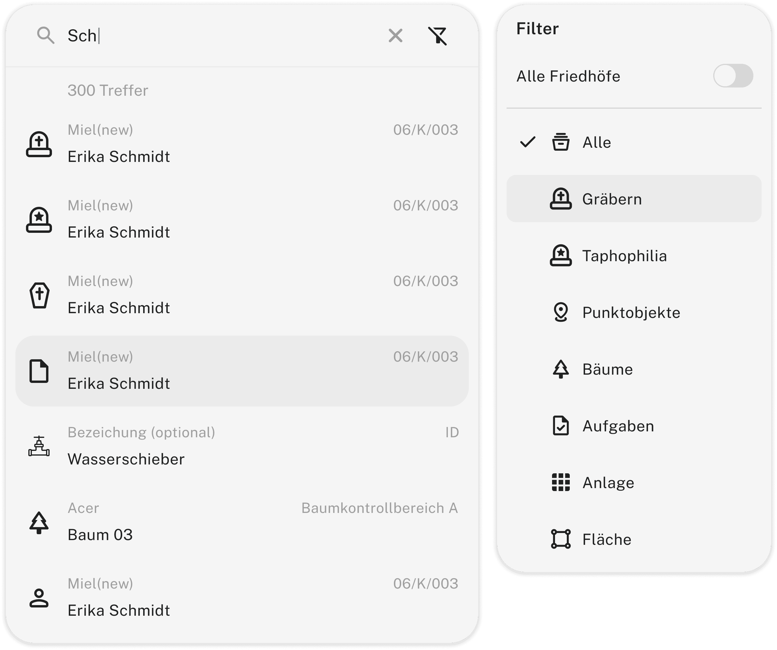 Die intelligente Suche ist für die mobile Nutzung optimiert und liefert gewünschte Informationen in Sekunden – zu Gräbern, Verstorbenen oder der Friedhofs-infrastruktur.